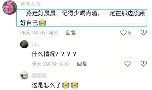 而大晨去世的原因与喝酒有着一定的关联。留言处有多位来自河南的网友表示:一路走好晨晨,记得少喝点酒,一定在那边照顾好自己。